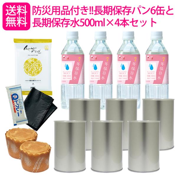 【送料無料(北海道・沖縄除く)】防災用品付き!!長期保存パン6缶と 長期保存水500ml×4本セット //非常食・災害・緊急・防災・備蓄・台風・停電・避難