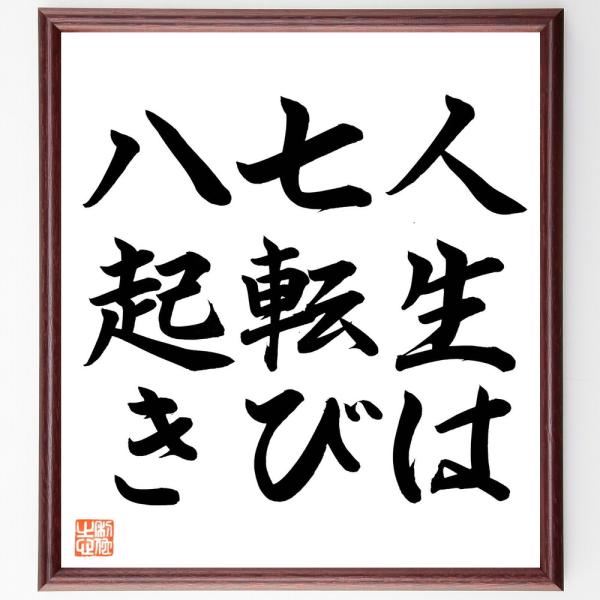 名言「人生は七転び八起き」手書き書道色紙額/毛筆直筆済み