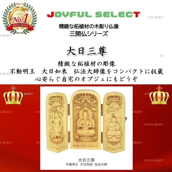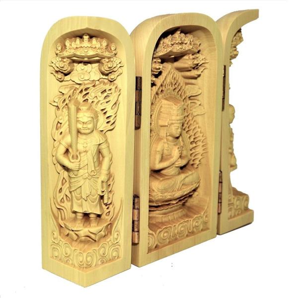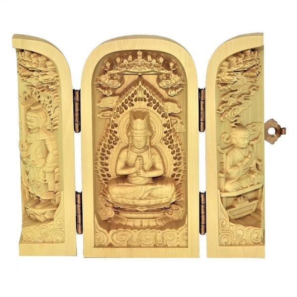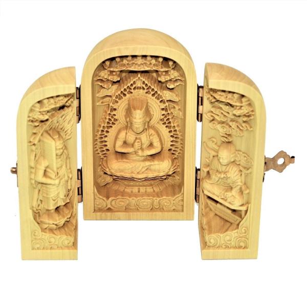 仏像 大日三尊 不動明王 大日如来 弘法大師 三開仏 木彫 ツゲ 置物 オブジェ コンパクト 高さ10cm 巾着ポーチ付き No5