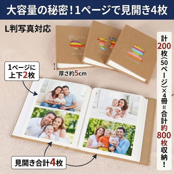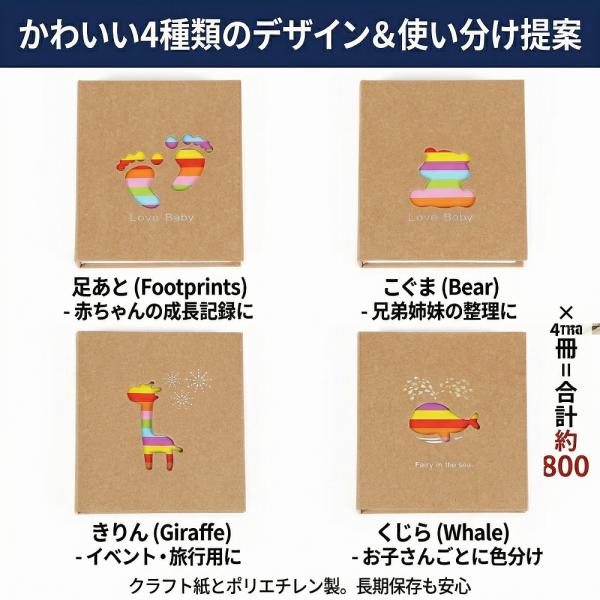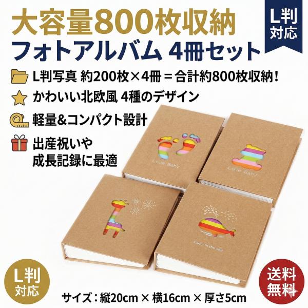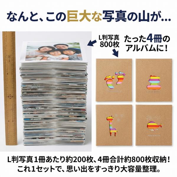アルバム 大容量 写真 L判 4冊セット 800枚 1冊200枚 クラフト紙 フォトアルバム 軽量 エコー写真 子供 安い かわいい カラフル 記念 誕生日 ギフト