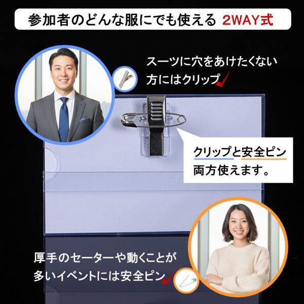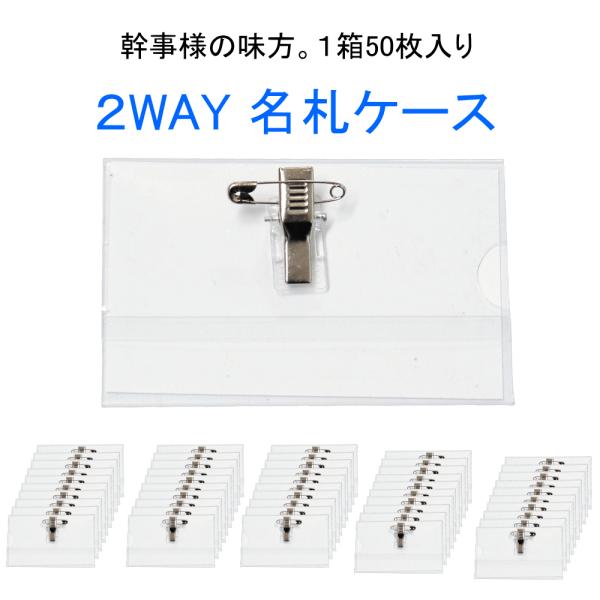 名札ケース 名刺サイズ 50枚セット 中紙付 クリップ 安全ピン 両用 透明 名札ホルダー 名刺 ネームカード ゲスト用 同窓会 忘年会 新年会