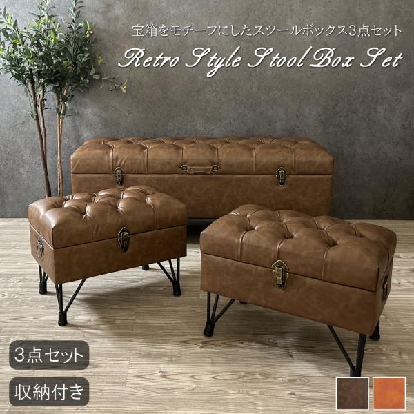 スツール オットマン 3点セット ベンチ チェアー チェア 長椅子 椅子 収納 いす イス 収納ボックス 収納BOX 宝箱 アンティーク レトロ おしゃれ 2人掛け 1人掛け