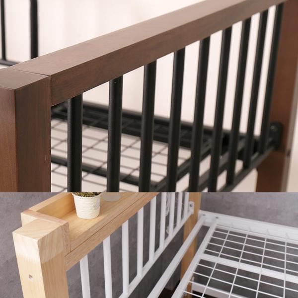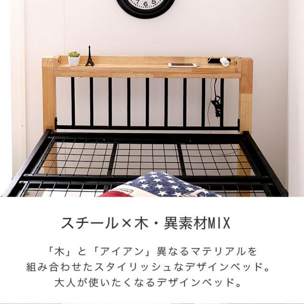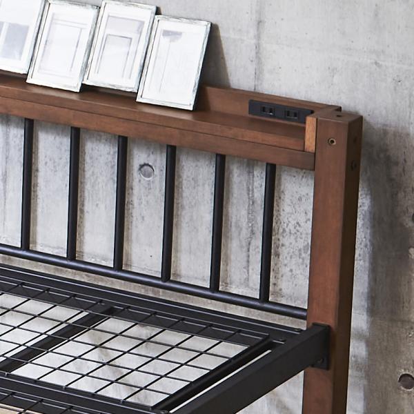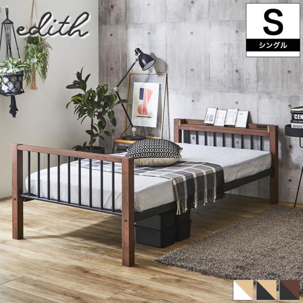 Edith アイアンベッド シングル 棚コンセント2口付 スチール×木・異素材コンビベッド ヴィンテージ調 ベッドフレーム