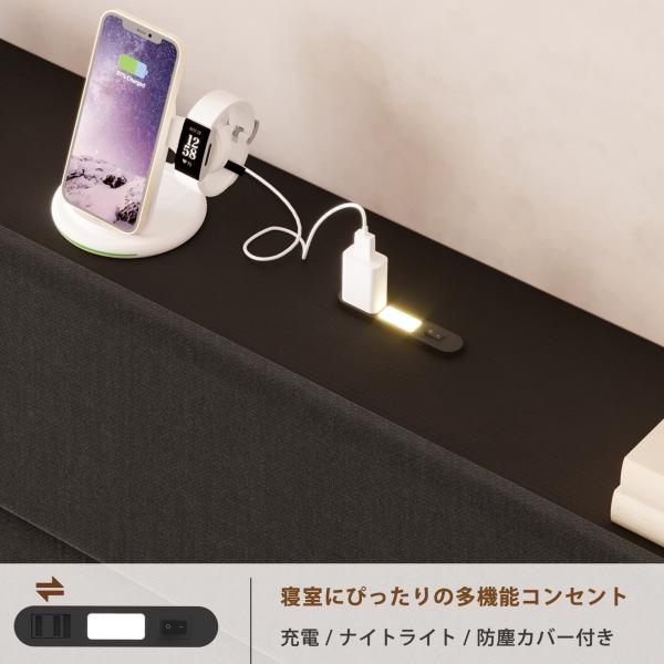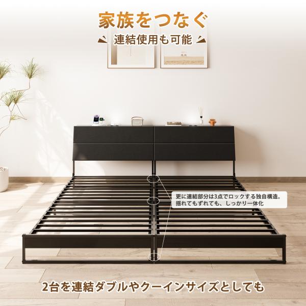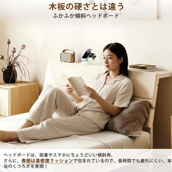 ファブリックローベッド シングル 連結ベッド 布張りベッドフレーム LEDライト&コンセント付き 宮棚付き 傾斜クッションヘッドボード フロアベッド