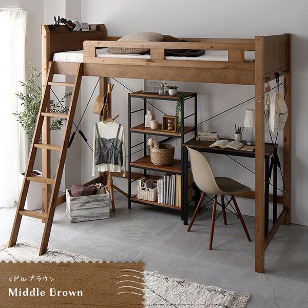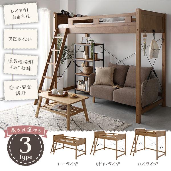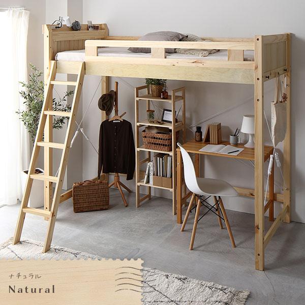 ロフトベッド シングル ロータイプ 床下76.5cm ベッドフレームのみ すのこ仕様 木製 天然木 宮付き 棚付き 2口 コンセント付き ロフトベット 送料無料