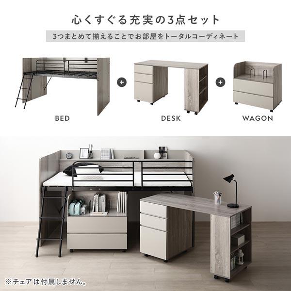 棚付 システムベッド 3点セット+マットレス付 ベッド 幅117cm ロータイプ シングル コンパクト ロフトベッド ベット 学習机 デスクワゴン 子供部屋 送料無料