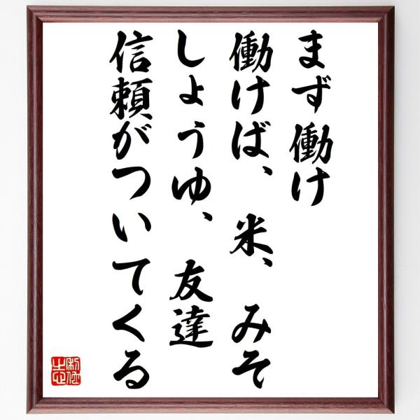 名言「まず働け、働けば、米、みそ、しょうゆ、友達、信頼がついてくる」手書き書道色紙額/受注後の毛筆直筆