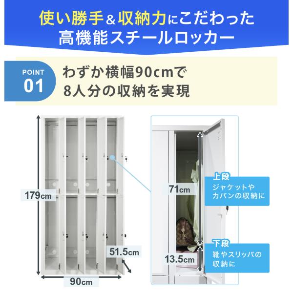 スチールロッカー 8人用 オフィス 更衣室 鍵付き 4列 2段 ホワイト 白 ブラック 黒