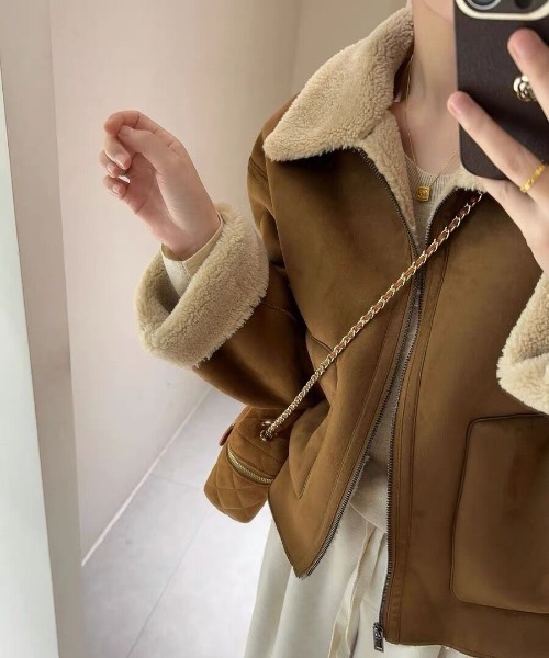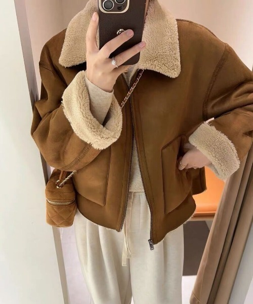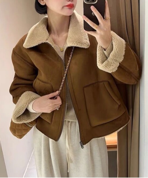 ムートンコート ボアコート ムートン風襟袖ボア切換えショートジャケット レディース