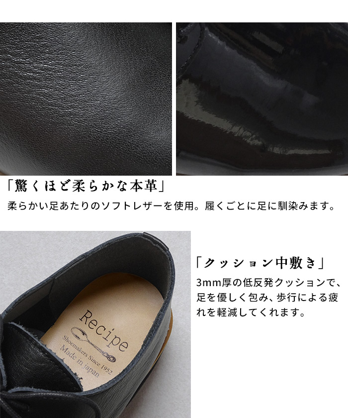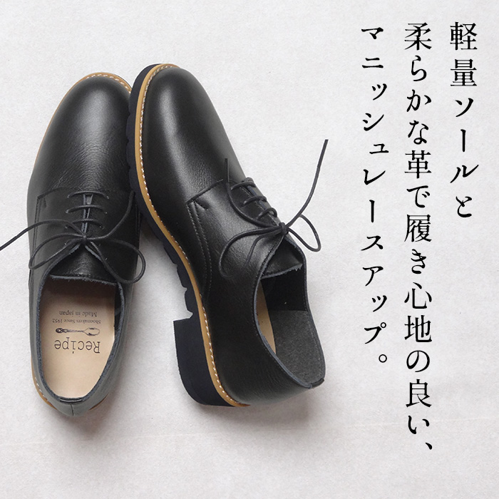 オックスフォードシューズ レディース 本革 エナメル 日本製 40代 50代 厚底 履きやすい レースアップシューズ Recipe レシピ RP-308K 2E相当