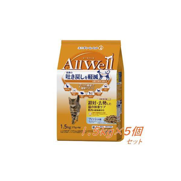 送料無料 ユニ・チャーム AllWell 避妊・去勢した猫の体重ケア 筋肉の健康維持 フィッシュ味 挽き小魚とささみFDパウダー入り 1.5kg×5個セット お取寄商品※