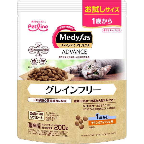 ペットライン メディファスアドバンス グレインフリー 1歳から チキン&フィッシュ味 200g(お試しサイズ) 【国産 キャットフード 総合栄養食 無着色】