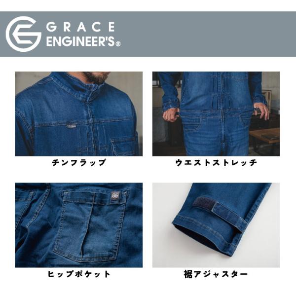 GRACE ENGINEER'S 秋冬 デニム ツナギ メンズ ストレッチ ヒップオープン 動きやすい 大きいサイズ SKプロダクト GE-653 長袖 sk-ge653-b