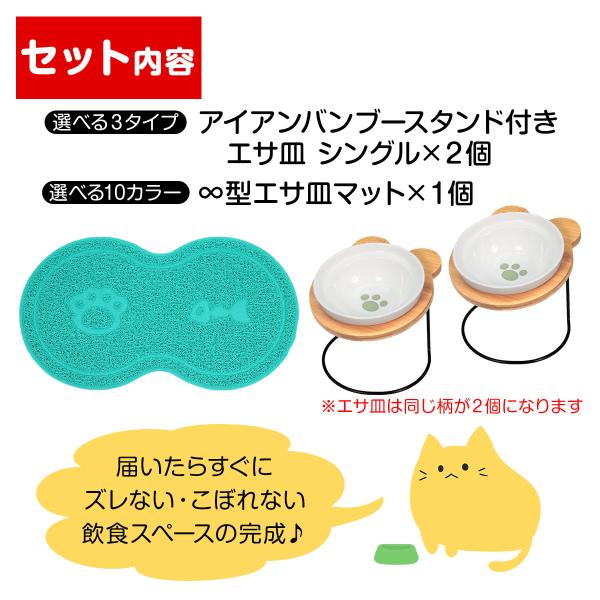 えさ皿 2個 ランチョンマット ∞型 セット 猫 犬 餌入れ フードボウル ペット マット 餌皿 滑り止め 陶器 アイアンバンブースタンドシングル