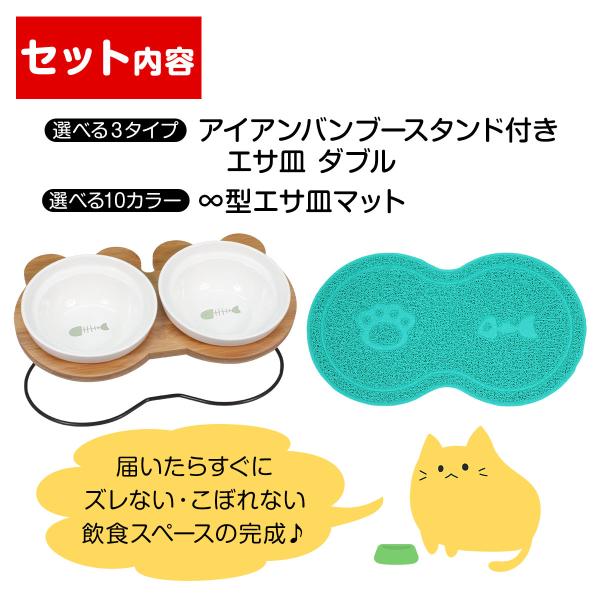 えさ皿 ランチョンマット ∞型 セット 猫 犬 食器 餌入れ フードボウル ペット 水飲み マット 食べやすい 餌皿 滑り止め 陶器 アイアンバンブースタンドダブル