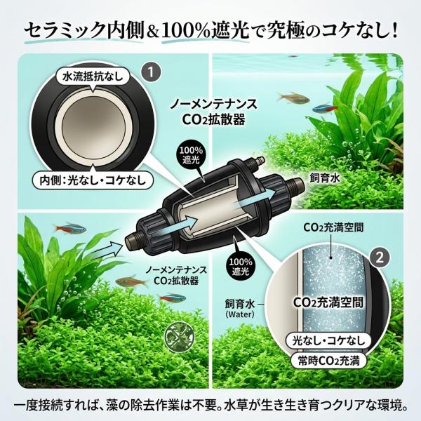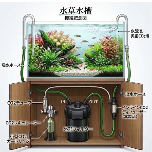 クリスタルアクア CO2拡散器 インライン - ウォーターフローCO2ディフューザースーパーミスト 外部フィルターホースに接続 水流に乗せてダイレクト添加