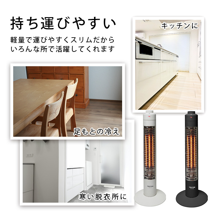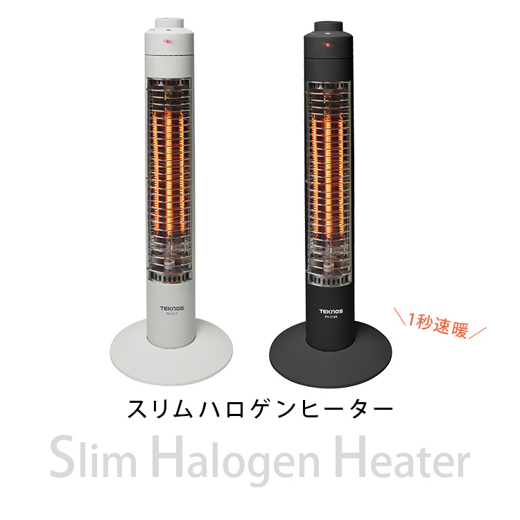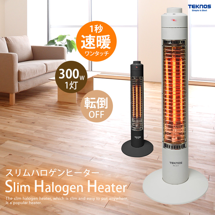 TEKNOS PH-319(ホワイト) PH-318K(ブラック) スリムハロゲンヒーター 300W(1灯) コードフック付 暖房 速暖 省エネ 転倒OFFスイッチ