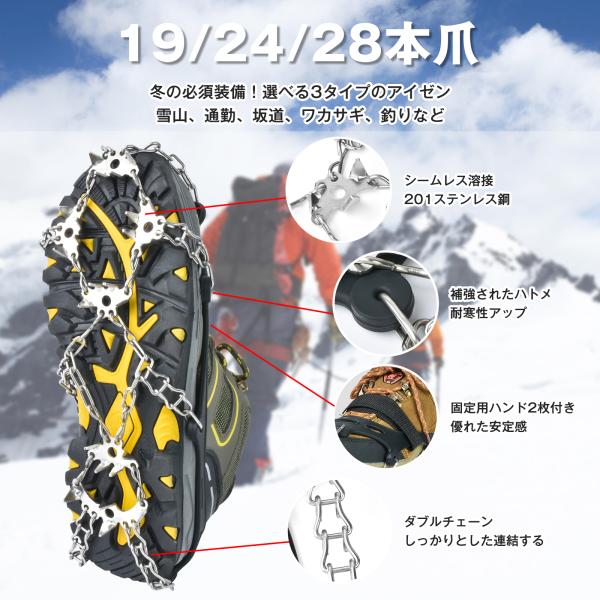 アイゼン スノースパイク 19/24/28本爪 雪 滑り止め 靴底 チェーンスパイク 登山 トレッキング 雪山 凍結道路 メンズ レディース キッズ 簡単装着 爆買