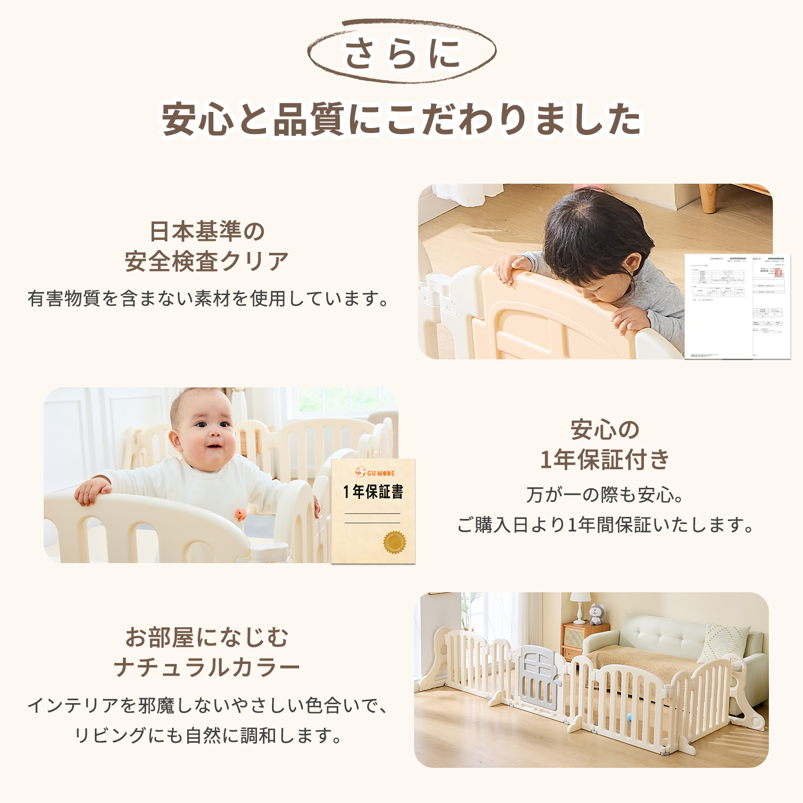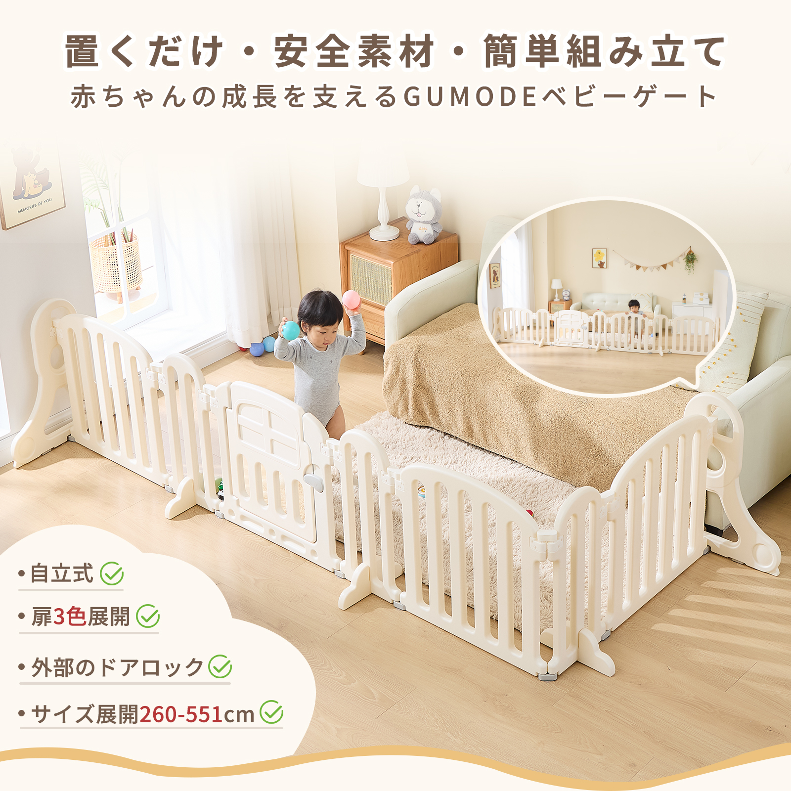GU MODE ベビーゲート ベビーサークル 最大幅260〜551cm 置くだけ ドア付き プレイヤード ベビーフェンス 柵 フェンス パーテーション 間仕切り 爆買