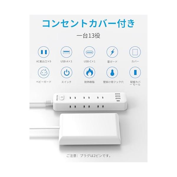 エムサインMscien コンセントカバー 赤ちゃん 電源タップ ベビーガード 延長コード2m 雷ガード 9個口 4個usb コンセント タップ