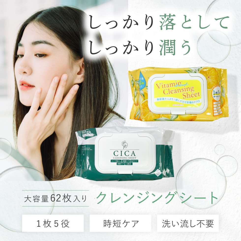 クレンジングシート 62枚入り 3個セット CICA シカ ビタミン レチノール メイク落とし 洗顔シート 毛穴 角質 化粧水 洗顔不要 ふき取り シート ポイント利用