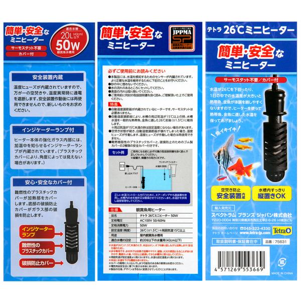 テトラ 26℃ミニヒーター 50W 安全カバー付 30cm水槽 20L以下 保温 サーモスタット+ヒーター一体型 安全機能付 アクアリウム 熱帯魚
