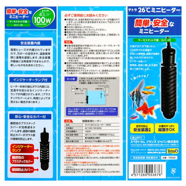 テトラ 26℃ミニヒーター 100W 安全カバー付 45cm水槽 40L以下 保温 サーモスタット+ヒーター一体型 安全機能付 アクアリウム 熱帯魚