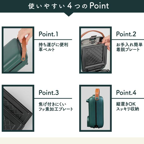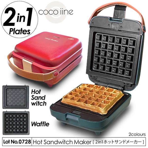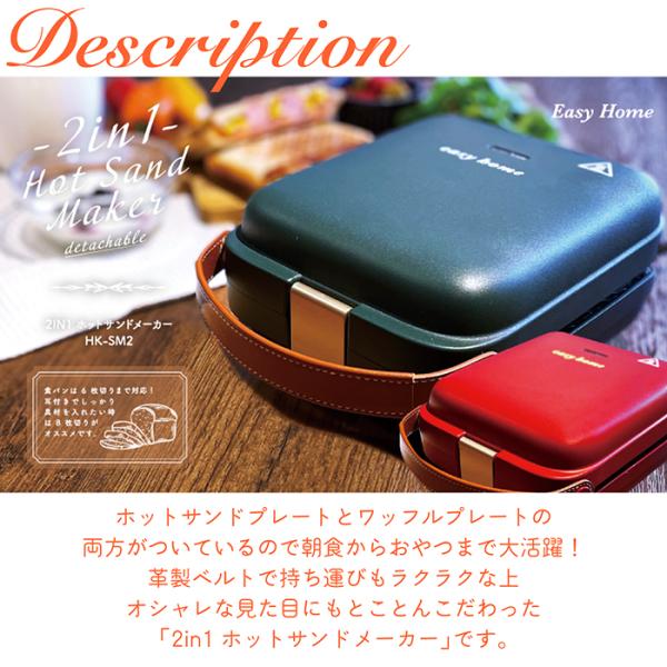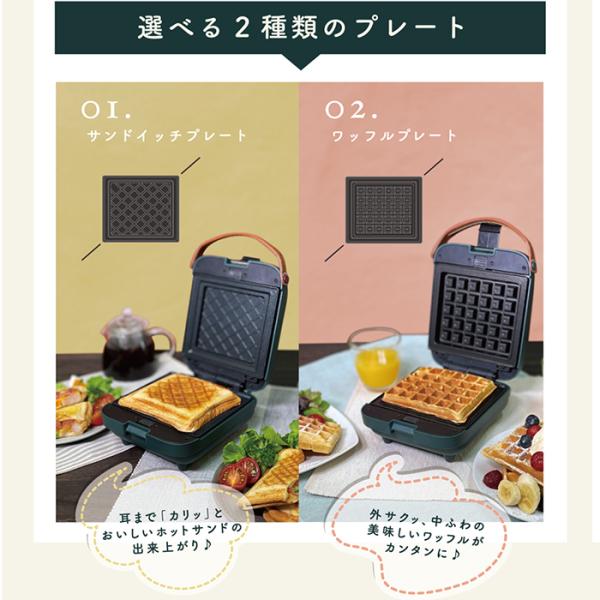ホットサンドメーカー 2in1 ホットサンド ワッフル 革製ベルト 着脱プレート フッ素加工コーティング 縦置き 2色展開 朝食 おやつ HK-SM2