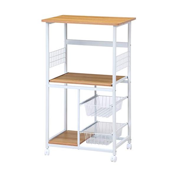 不二貿易 レンジ台 キッチンラック 幅60×奥行46×高さ103.5cm ホワイト ナチュラル スライド棚 収納 レンジワゴン キャスター付き