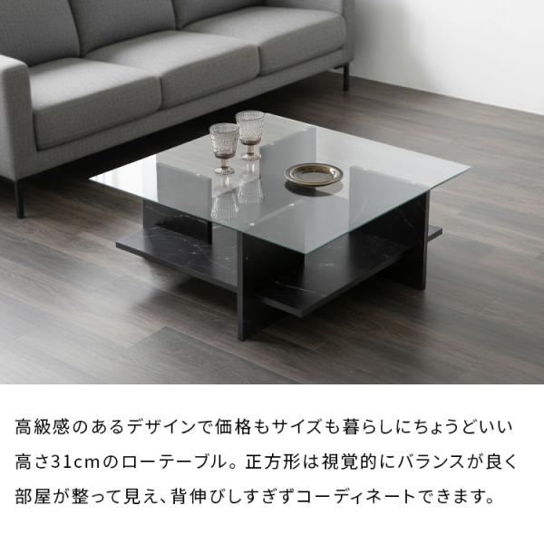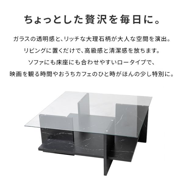 ガラス天板センターテーブル おしゃれ リビングテーブル 家具 ガラス天板 収納付き ローテーブル 大理石柄 正方形 一人暮らし 高級感 モダン 黒