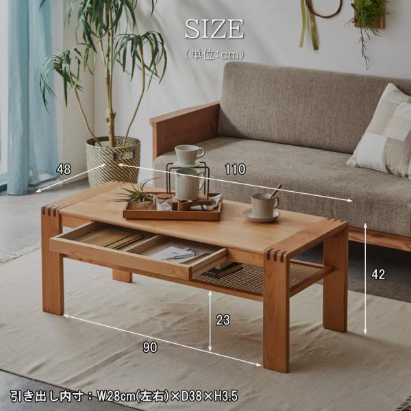 テーブル ローテーブル リビングテーブル センターテーブル アルダー無垢 幅110cm おしゃれ 北欧 ナチュラル モダン 木製 棚付き 引き出し付き 収納 PEラタン