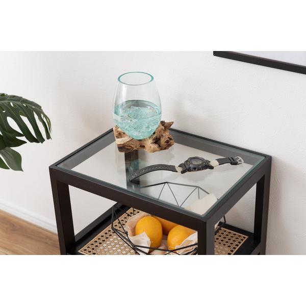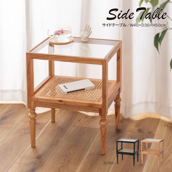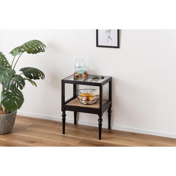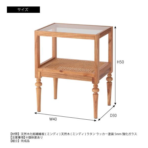 サイドテーブル PM-511 ベッドサイドテーブル ソファサイドテーブル 木製 天然木 ミンディ ラタン 籐 幅40cm 高さ50cm ガラス クリア 透明 収納 棚 ろくろ脚