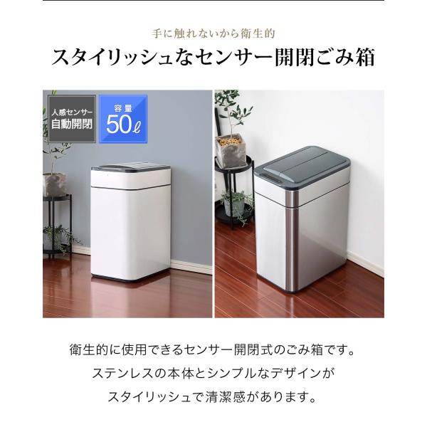 ゴミ箱 自動開閉 50L ふた付き スリム 幅 27.5cm 容量 45リットル ゴミ袋対応 センサー かざす 人感センサー ステンレス スクエア 角型 1年保証 送料無料