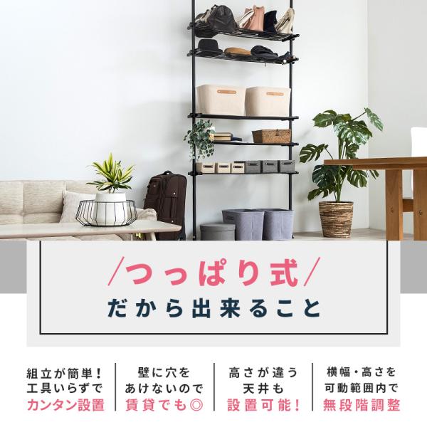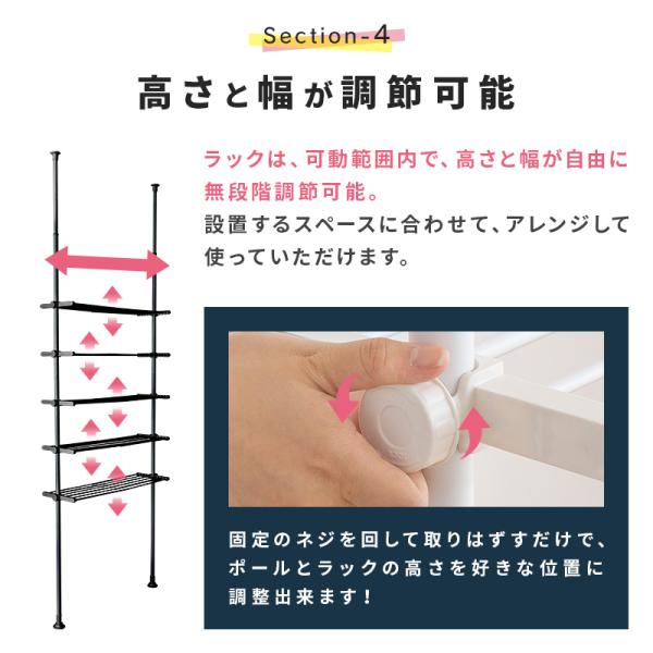 突っ張り 5段ラック ラック ランドリーラック 収納家具 おしゃれ シンプル 支柱高さ伸縮 ヨコ幅伸縮 ラック高さ 無段階調整 キッチン収納 リビング収納