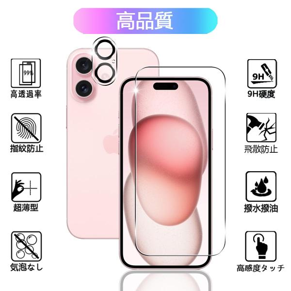 対応 iPhone 16 ガラスフィルム 2枚 + iPhone16 レンズフィルム 2枚 6.1インチ ガイド枠付き 日本旭硝子製 対応 いP