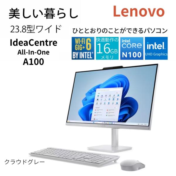 【新品】 Lenovo レノボ 一体型 デスクトップPC IdeaCentre A100 23.8型/ Intel N100/ メモリ 16GB/ SSD 256GB/ Windows 11/ Office付き選択可能/ Webカメラ