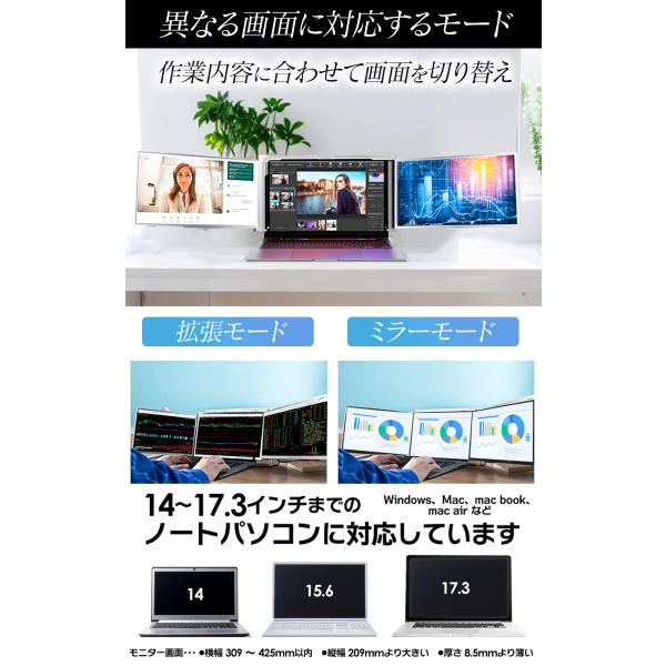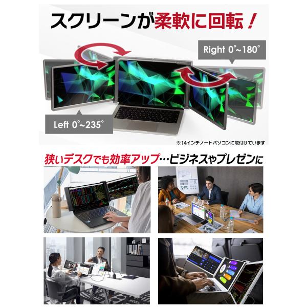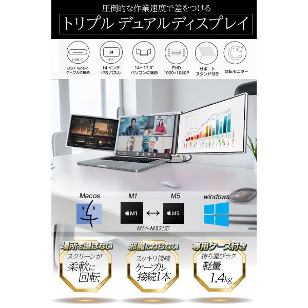 モバイルモニター 超軽量1.4kg 3画面 マルチ トリプルモニター トリプルディスプレイ ノートパソコン 14〜17.3インチ対応 デュアルディスプレイ 拡張 爆買