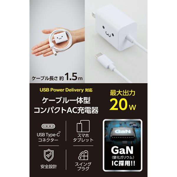 エレコム スマホ・タブレット用 USB Power Delivery 20W ケーブル一体型 AC 充電器 USB-C ケーブル一体 タイプC type-c 1.5m しろちゃん EC-AC6920WF
