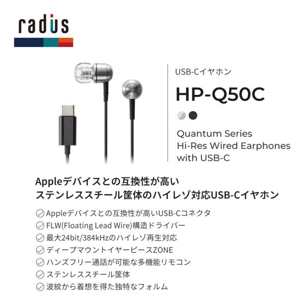 ラディウス radius HP-Q50C USB-C接続 有線イヤホン|ハイレゾ対応 マイク付き USB-C Type-C タイプC iPhone 17 Android イヤホン カナル型 ギフト