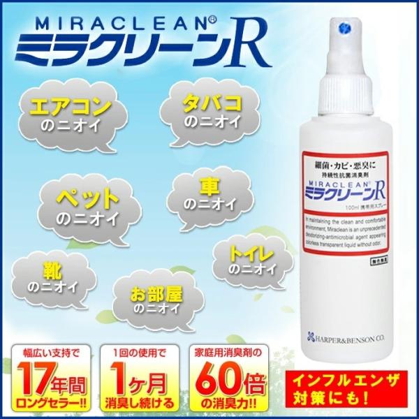 消臭スプレー 抗菌 抗ウイルス 業務用 60倍の消臭力 マスク タバコ エアコン 車 部屋 靴 ペット 携帯 インフルエンザ 大腸菌 サルモネラ菌ミラクリーンR 100ml