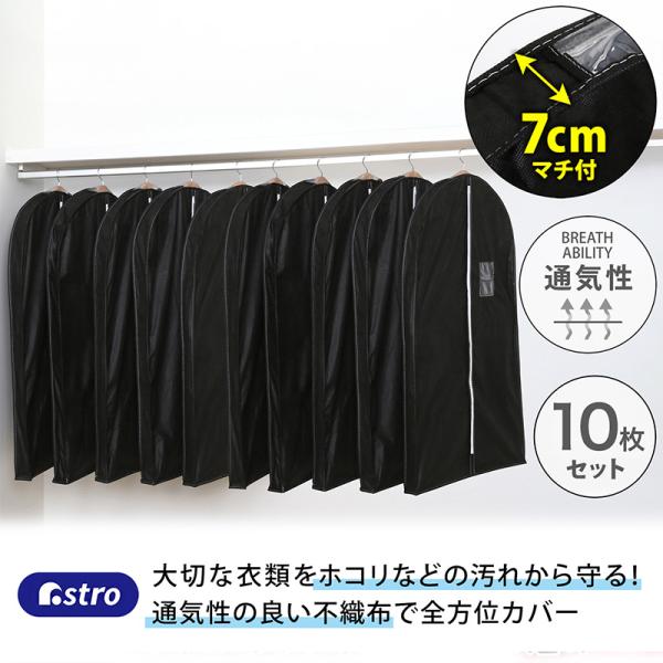 アストロ公式 製品保証付き 衣類カバー マチ付き ブラック ショートサイズ 10枚組 洋服カバー 不織布 防虫剤ポケット 透明窓 スーツ 衣装 カバー 110-79