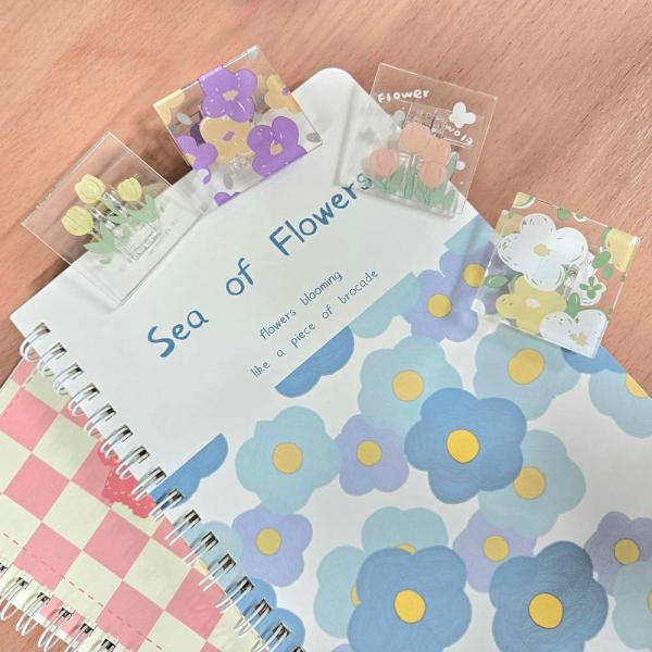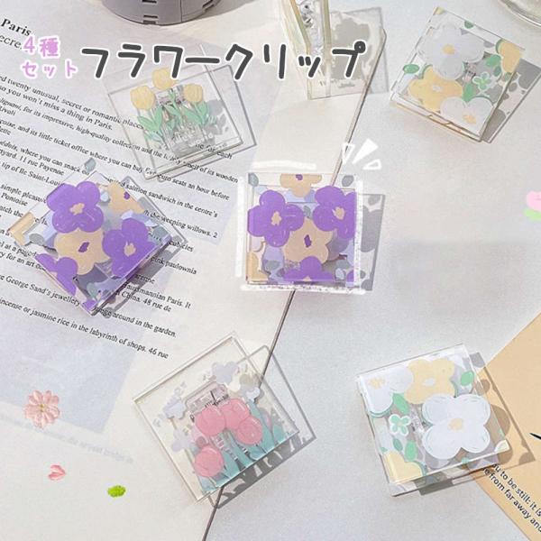 【4種セット】フラワーアクリルクリップ お花 花柄 フラワー 韓国 スクエア クリア 文具 かわいい おしゃれ ギフト