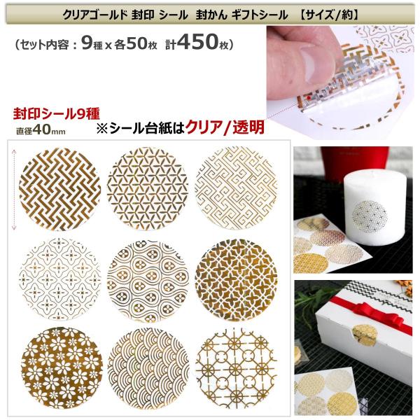 透明 ゴールド 封印 封かん シール 模様 ギフトシール 招待状 案内状 ラベル ステッカー クリアゴールド(9種 450枚)