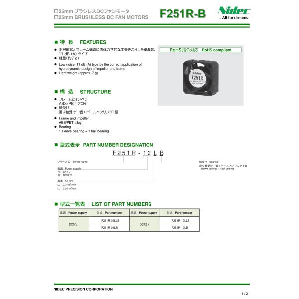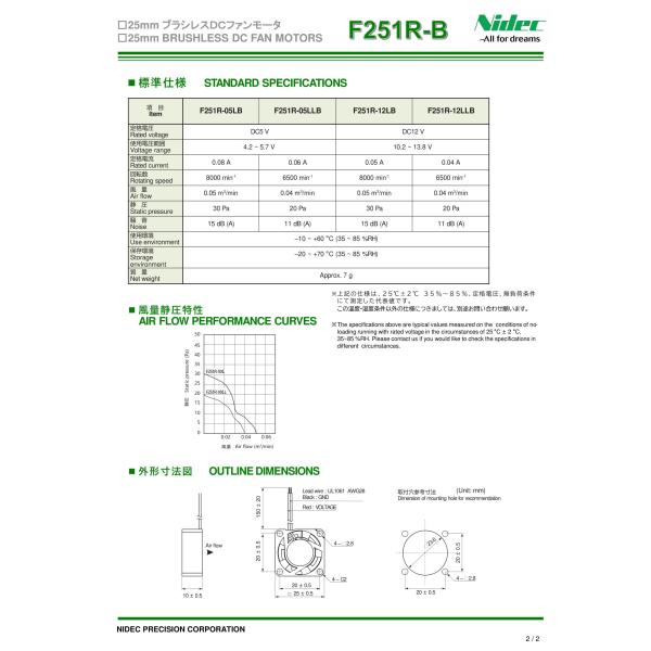 F251R-12LB 12V 25mm角ファンモータ Nidec(ニデックプレシジョン/旧日本電産コパル)