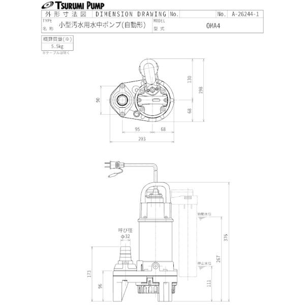ツルミポンプ 水中ポンプ 100V 小型 自動型 排水ポンプ OMA4 0.15kw 32mm 150w 鶴見ポンプ 家庭用 汚水ポンプ 雨水排水