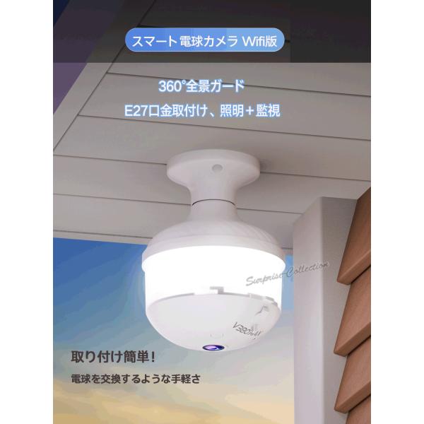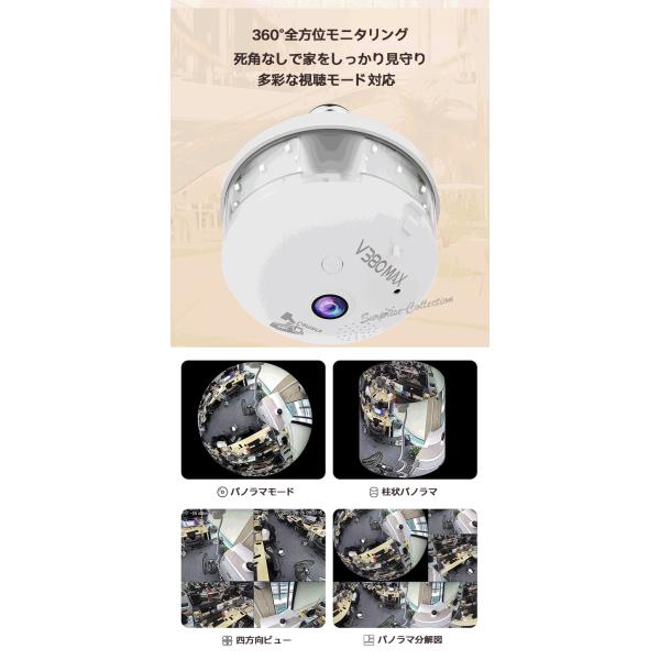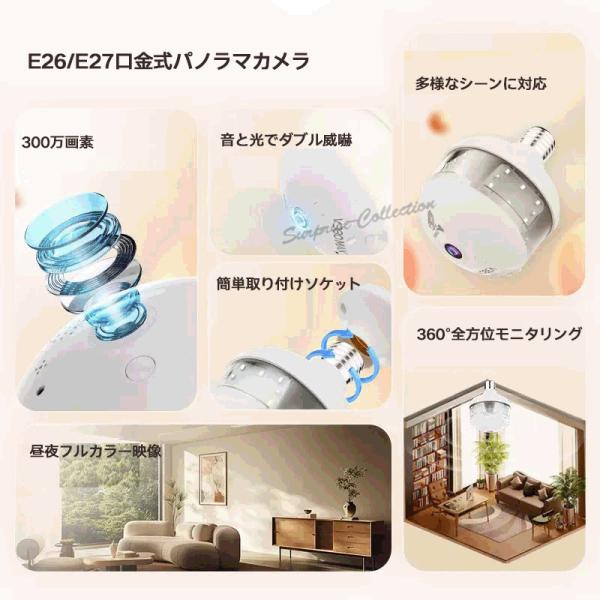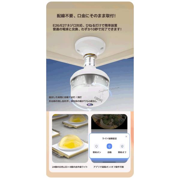 パノラマ映像電球カメラ 防犯 監視 照明 E26 E27 360°見守り 300万画素 V380Pro 簡単設置