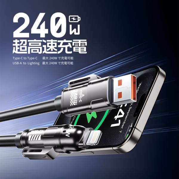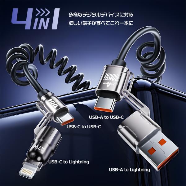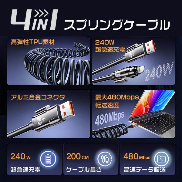 【1500円から〜2個目半額/3個目タダ】 4in1 スプリングケーブル 2m USB-A USB-C to USB-C Lightning 充電 データ転送 PD240W 480Mbps 4in1-240送料無料