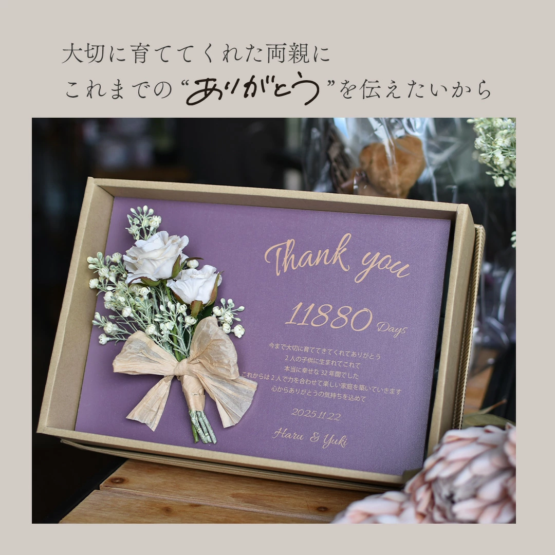 【サンクスボード/a4-artflower】子育て感謝状 成人式 木製ボ-ド 入籍 結婚 結婚式 両親に贈る アートフラワー 造花 両親贈呈品 プレゼント ウエディング 名入れ