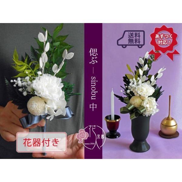 shinobu-偲ぶ(中)花器入り プリザ 白 供花 仏花 お盆 お彼岸 お悔やみ 枕花 命日 ペット 仏事 法事 四十九日 葬儀 初盆 一周忌 三回忌