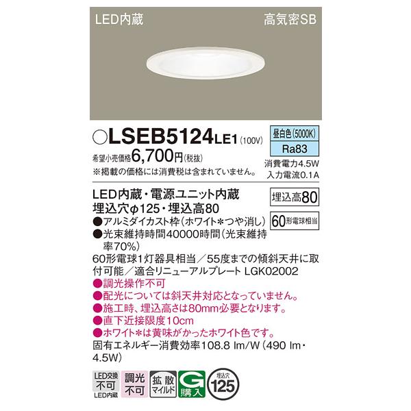 在庫あり パナソニック LSEB5124LE1 ダウンライト 60形相当 昼白色 埋込穴 125 調光不可 相当品 LGD1200NLE1 [ LSEB5124 LE1 ]